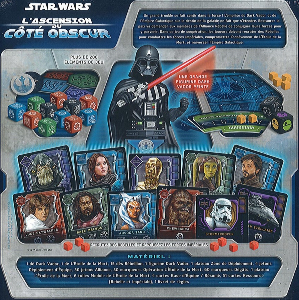 Star Wars : L’ Ascension du Coté Obscur est un jeu de cartes et de dés coopératif inspiré des événements qui ont précédé et traversé Star Wars : Un nouvel espoir. Dans le jeu, les joueurs doivent œuvrer ensemble pour recruter des rebelles et empêcher la construction de l’arme ultime, l’étoile de la mort.