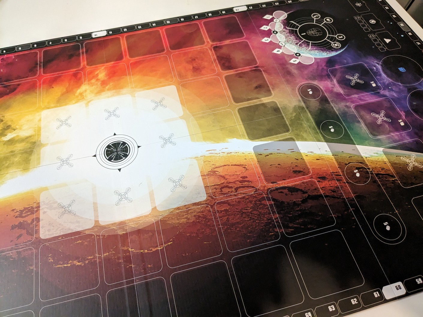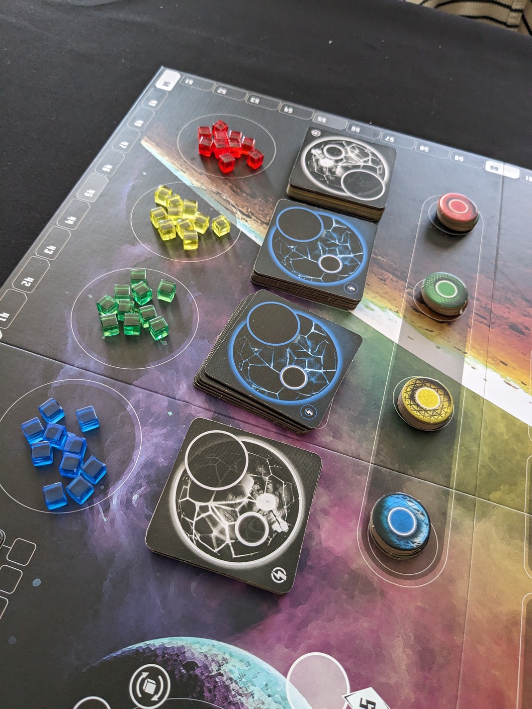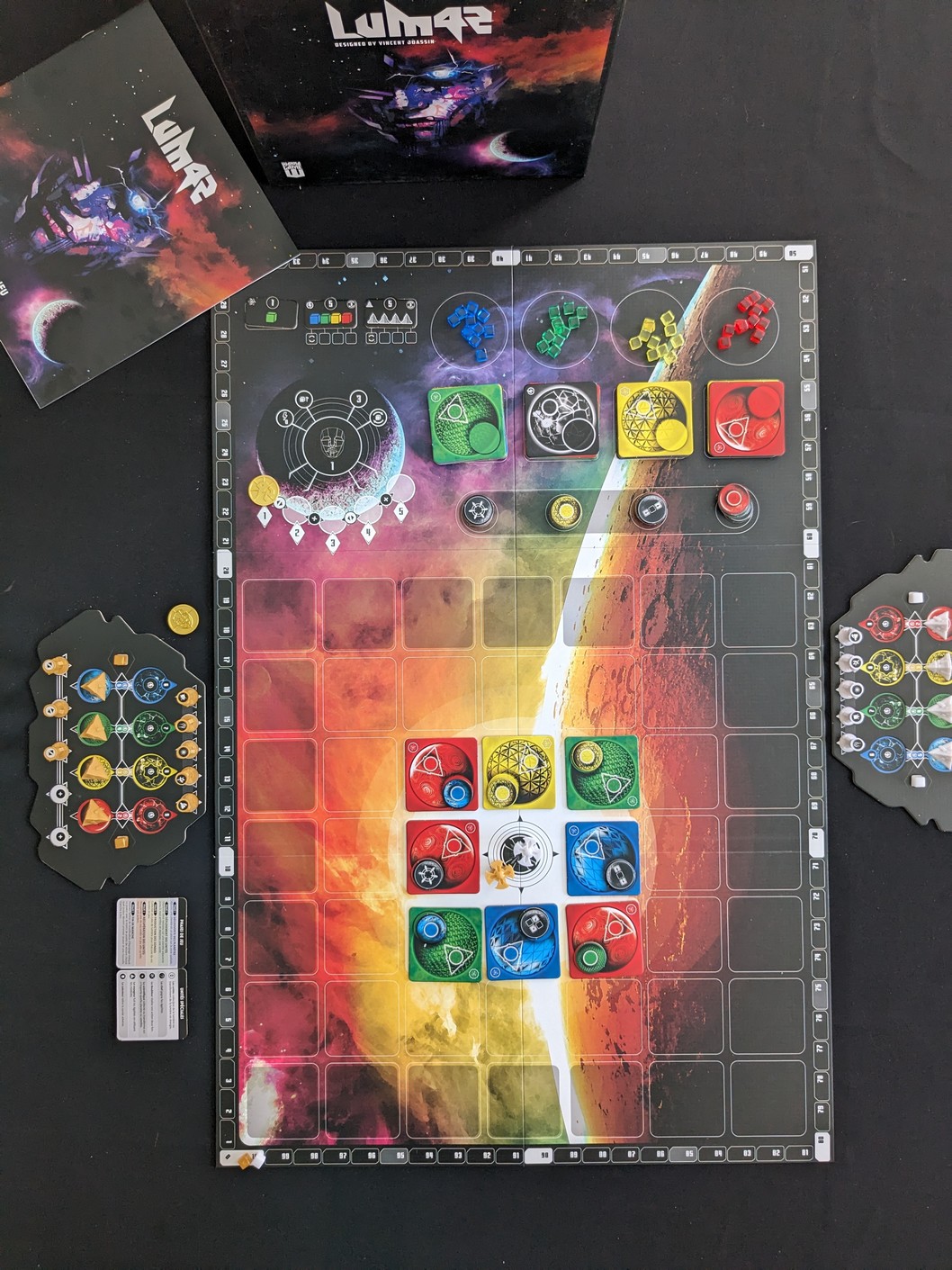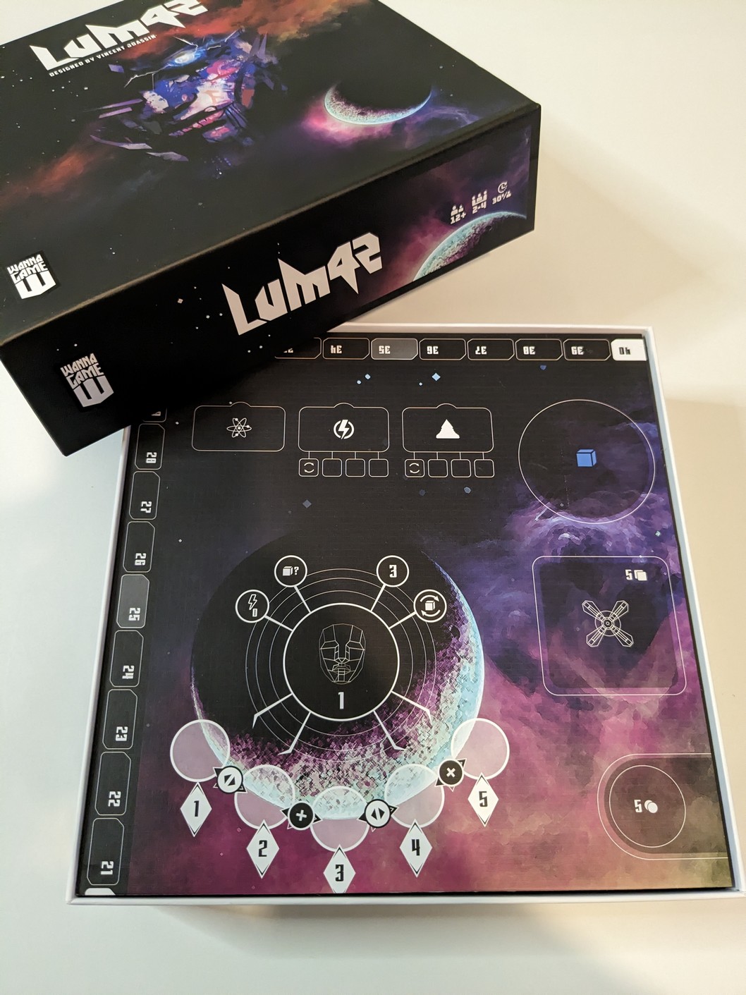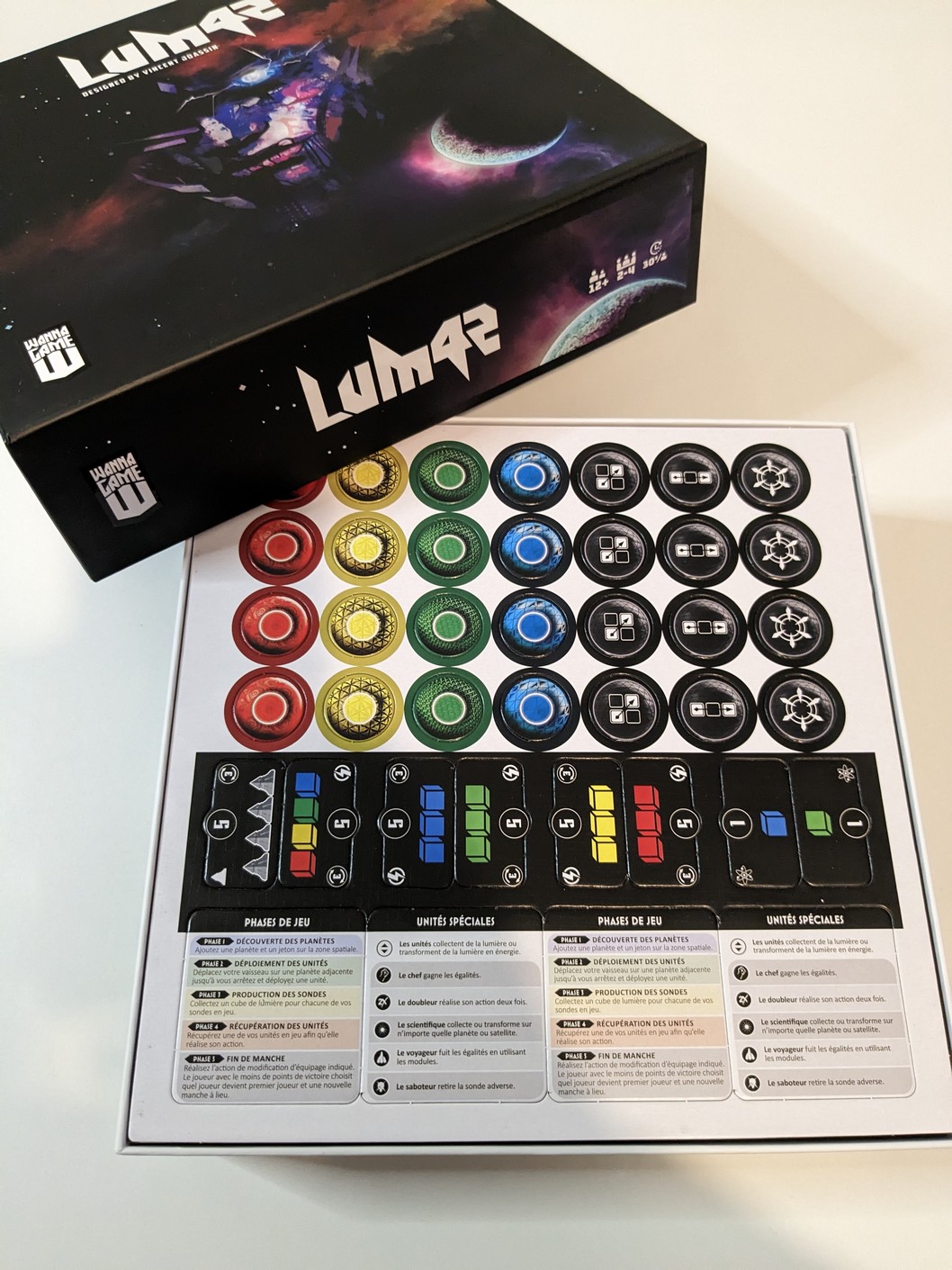 À l’ouverture du colis, on découvre une boite carré au format contenu, superbement illustrée, dans une thématique spatiale. C’est du plus bel effet, en tout cas moi ça me parle et me donne envie d’aller plus loin. L’ouverture renferme les différents éléments, livret de règle, plateau principal, plateaux joueurs double couches, les punchboard avec les tuiles et les jetons, les pièces métallique, les différentes unités en plastiques, les cubes de lumière, le tout se rangeant parfaitement bien dans l’insert parfaitement adapté et prévu. Le matériel est de bonne qualité et ce n’est qu’un exemplaire de préproduction, certes proche du définitif. Les améliorations encore à apporté se feront principalement sur les Unités.