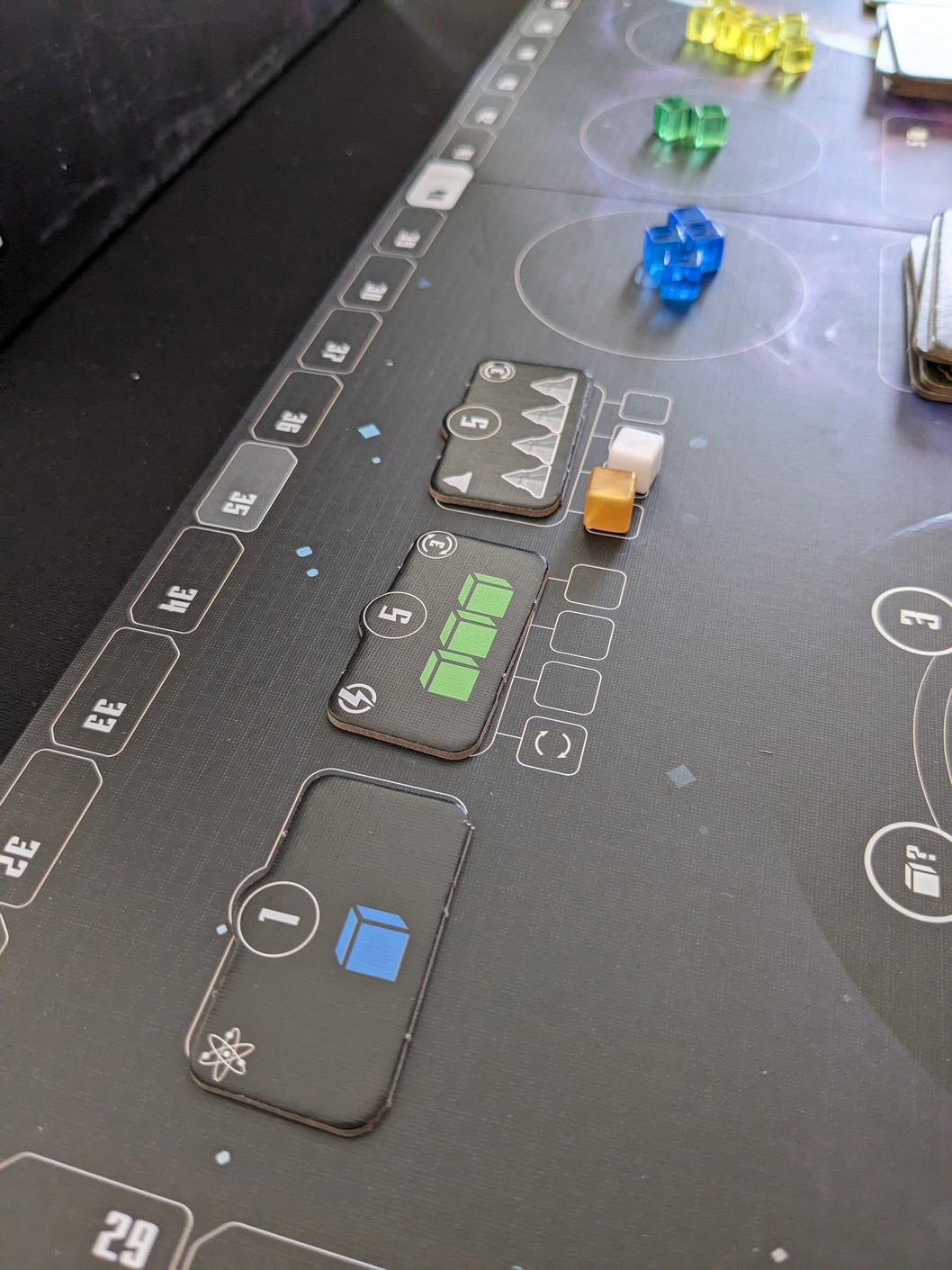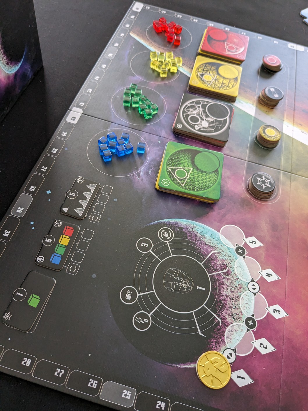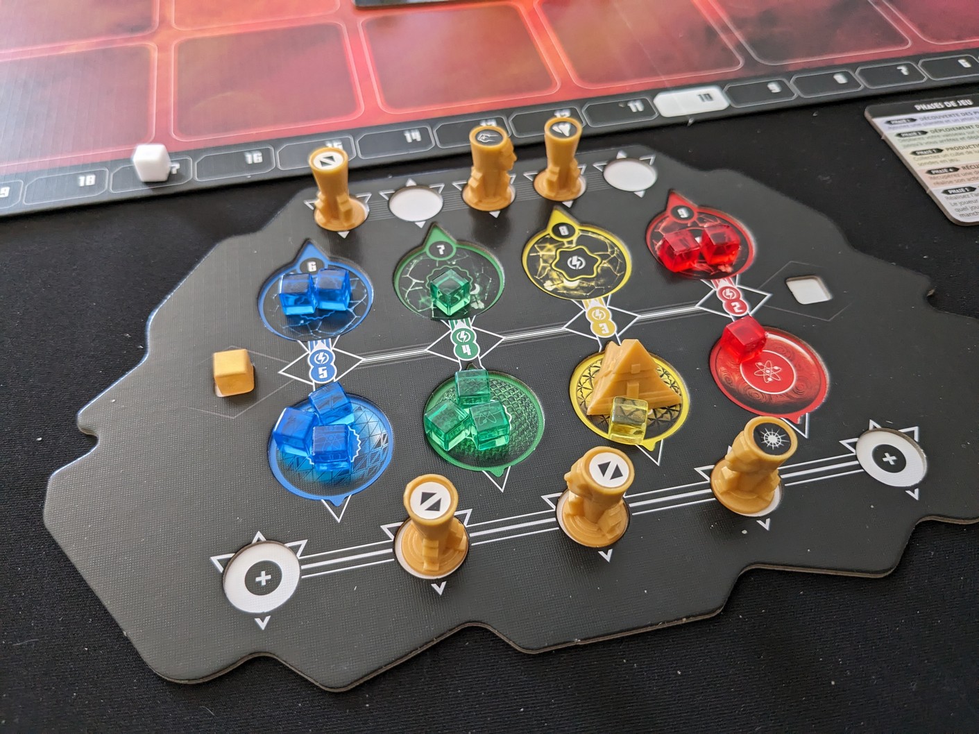 Dans l’ordre du tour, en commençant par le 1ᵉʳ joueur, chaque joueur collecte automatiquement une lumière pour toutes ses sondes en jeu. Le cube de lumière récupéré est de la couleur de la planète sur laquelle se trouve votre sonde. Pour ce facilité la vie, il suffit de regarder son plateau joueur et d’un coup d’œil, on sait ceux qui sont en jeu ou pas.