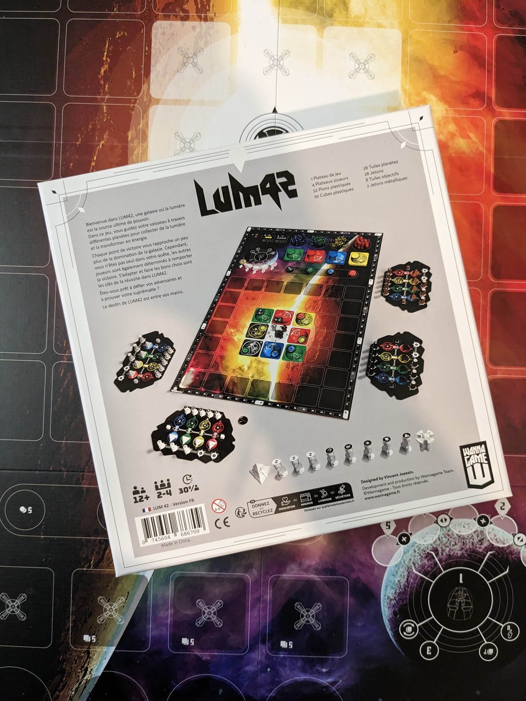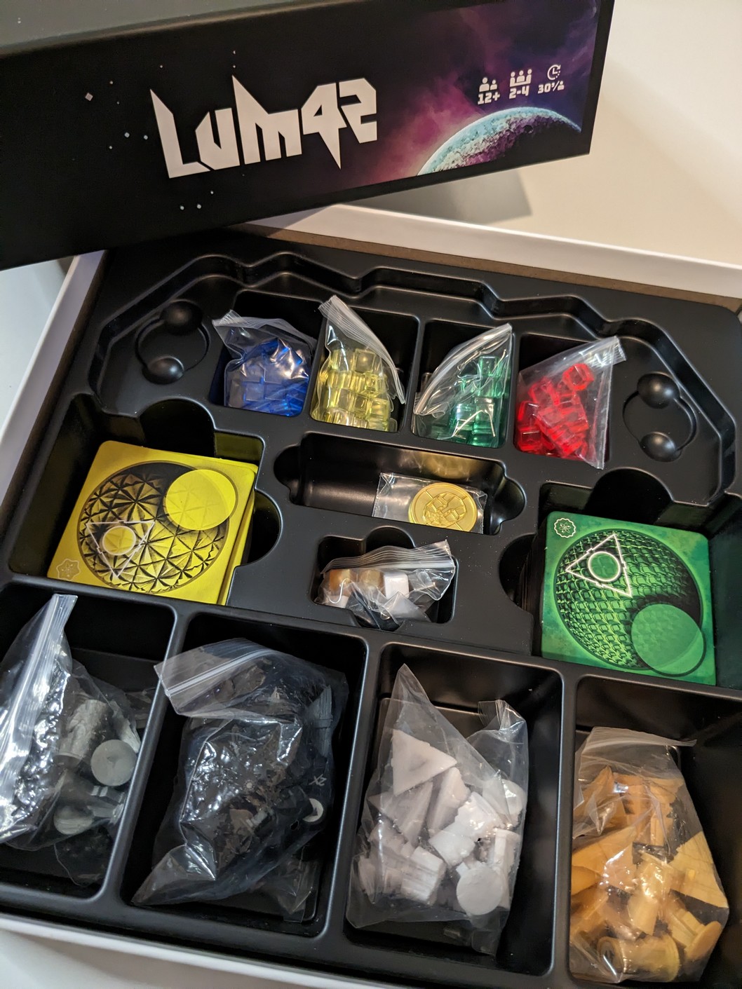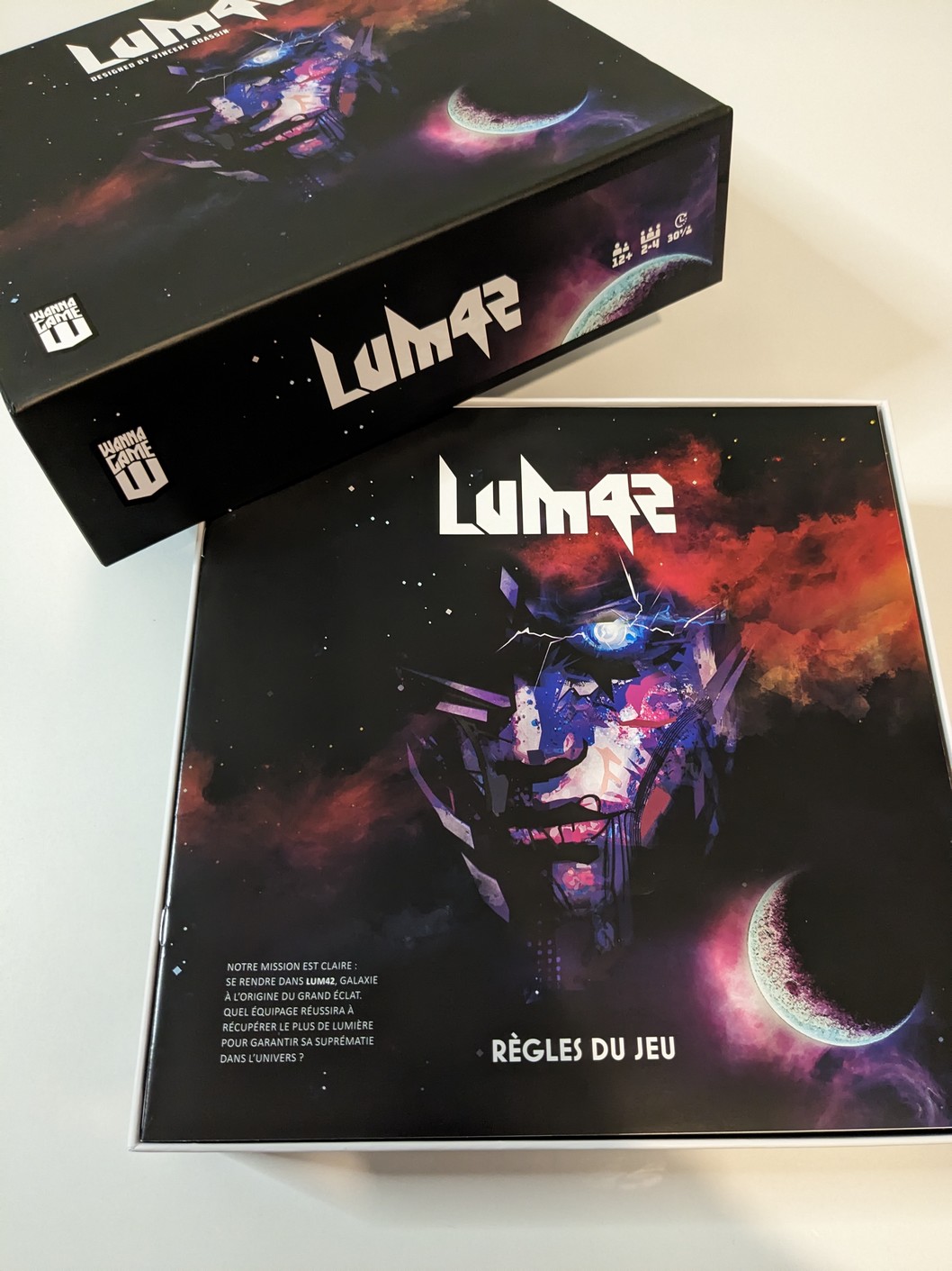 Quand on reçoit un jeu en avant-première, surtout pour un financement participatif, afin de le faire découvrir aux joueurs, issu d’une toute nouvelle maison d’édition, française et pour leur premier jeu, cela donne un petit pincement au cœur et on se sent investi d’une certaine mission, même si on doit être le plus impartial possible, ce qui pour être honnête me semble franchement difficile. C’est pour cela aussi que je choisis les jeux que je souhaite chroniquer, comme cela, j’ai beaucoup moins de mauvaises surprises. C’est donc avec plaisir que j’ai reçu Lum42, non sans une certaine excitation. A l’ouverture du colis, on découvre une boite au format contenu, arborant une magnifique illustration évoquant un être tout droit sorti de l’espace et du futur. On n’aura aucun doute sur la thématique choisie par l’auteur. Même si le matériel présenté n’est pas définitif, l’ouverture de la boite ne laisse aucune sensation désagréable, bien au contraire. Tout est plutôt de qualité et la présence d’un Insert en plastique, pour une fois bien étudié, permet de parfaitement ranger l’ensemble du matériel.