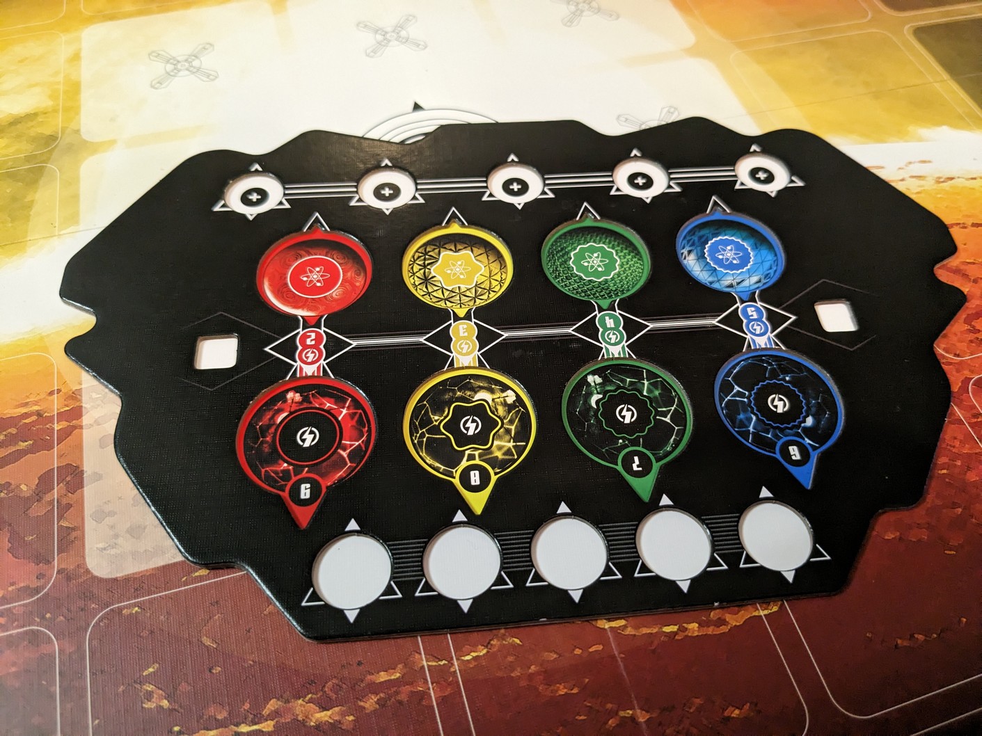 - Énergie : permet au joueur de gagner des PV dès qu’il possède le nombre de cubes de la couleur indiquée dans sa zone d’énergie.
