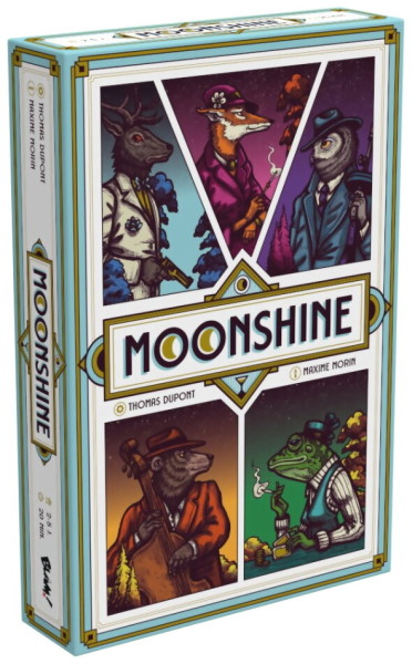 Moonshine Plongez dans l’univers secret de la prohibition… A la tête d’un bar clandestin, tirez parti au mieux du partage des ressources interdites afin d’attirer des clients au pouvoir d’influence bien utile. Faites les meilleurs choix pour prospérer dans l’ombre et devenir l’adresse cachée la plus prisée de la forêt ! Moonshine est un jeu de construction de moteur avec des dés dans lequel les joueurs jouent en simultané. A chaque tour de jeu, chacun exploite le résultat des dés obtenu par le joueur actif, afin de renforcer l’attrait de son bar clandestin. Le but du jeu est d’attirer suffisamment de clients pour atteindre 12 points de prestige. Lorsqu’un joueur y parvient, la partie se termine alors et c’est celui ou celle avec le plus haut score qui l’emporte. Une partie consiste en une succession de tours, qui se déroulent tous de la même manière : d’abord le joueur actif lance – et éventuellement relance – tous les dés auquel il a accès pour valider un pool de dés. Puis chaque joueur dispose des icônes obtenues comme ils le souhaite. Ces icônes représentent des ressources interdites prisées de clients potentiels (chaque joueur dispose de ses propres clients potentiels). Satisfaire les besoins spécifiques d’un client permet de le faire entrer dans son bar et d’ainsi bénéficier de son bonus permanent : points de prestige, ressources, relances, accès à d’autres dés (dés bleu et rouge), à d’autres clients potentiels, etc. Si jamais un joueur ne veut pas ou ne peut pas exploiter le résultat des dés, il n’est pas bloqué ! Il peut soit récupérer un jeton Lune à placer sur l’une de ses cartes afin de débloquer un bonus temporaire; soit remplacer l’un de ses clients potentiels par un nouveau.