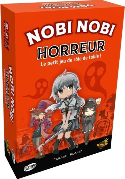 Nobi Nobi Horreur Le petit jeu de rôle de table ! Le retour du jeu de rôle Nobi Nobi pour débutants et experts, créé par Don’t Panic Games, dans sa version : Nobi Nobi Horreur ! Fantômes, monstres, hôpitaux abandonnés et forêts obscures… Bienvenue dans un monde d’horreur (mais pas trop), envahi par la peur ! Dans ce jeu de rôle sur table dynamique et fluide, votre quête se construit carte après carte, au fil des indications et des multiples rebondissements. Lancez les dés, jouez vos cartes et créez votre histoire entre amis. Hormis votre imagination, tout ce dont vous avez besoin tient dans cette boîte ! Simple et didactique, Nobi Nobi séduira les rôlistes expérimentés comme les novices ! Nouveau : les cartes personnages changent de côté selon le nombre de cartes Lumière et Ténèbres piochées !