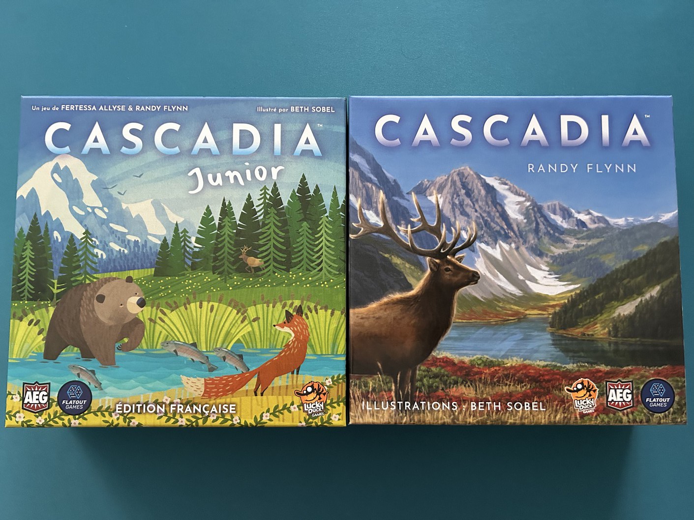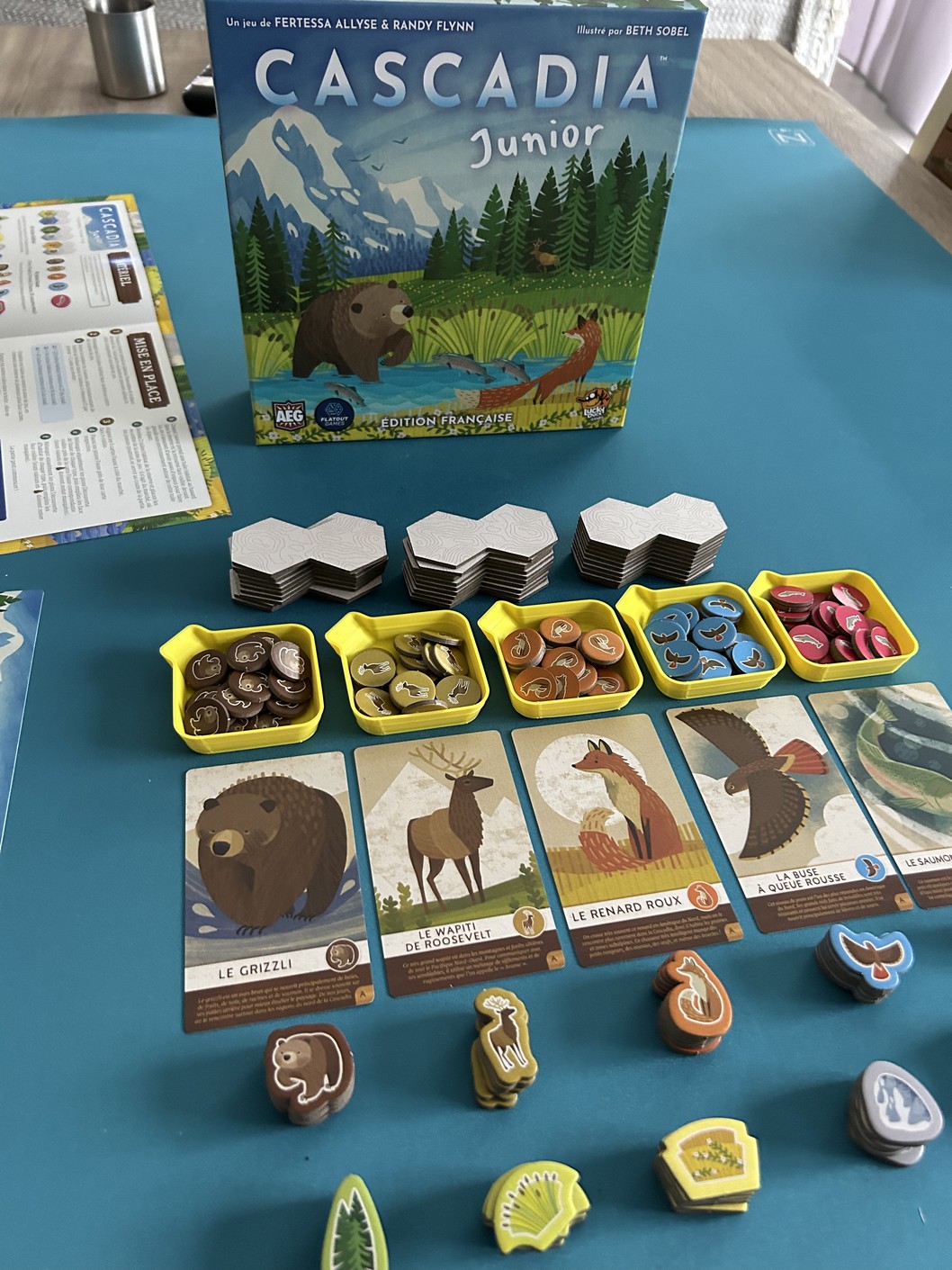 J’ai toujours beaucoup aimé le premier Cascadia, alors il était évident que j’allais m’intéresser à sa version Junior. Sur le papier, le jeu me séduisait déjà : parfait pour partager un bon moment avec ma fille. Les premiers visuels m’ont immédiatement plu, avec cette direction artistique fidèle à l’esprit du jeu original.