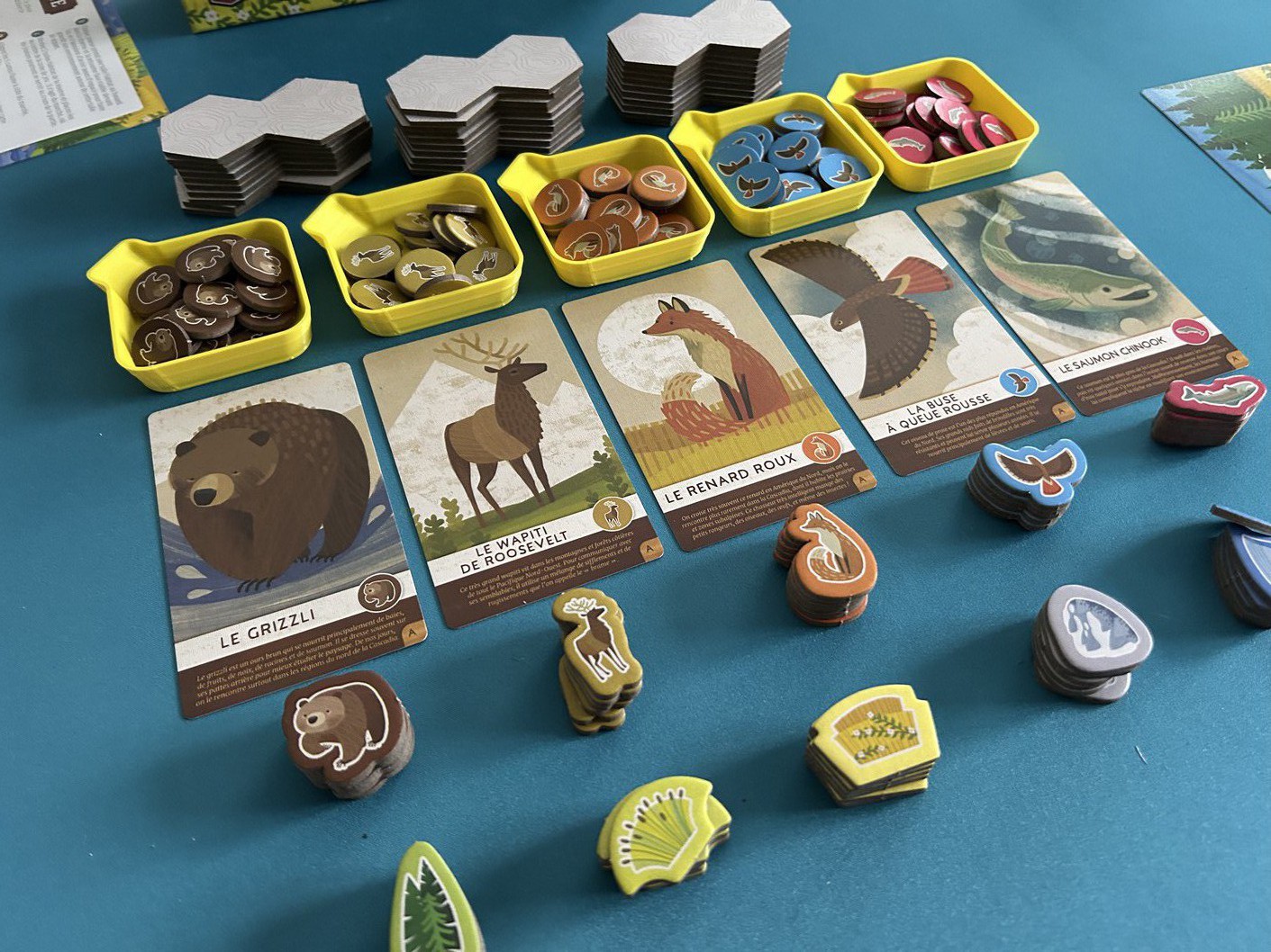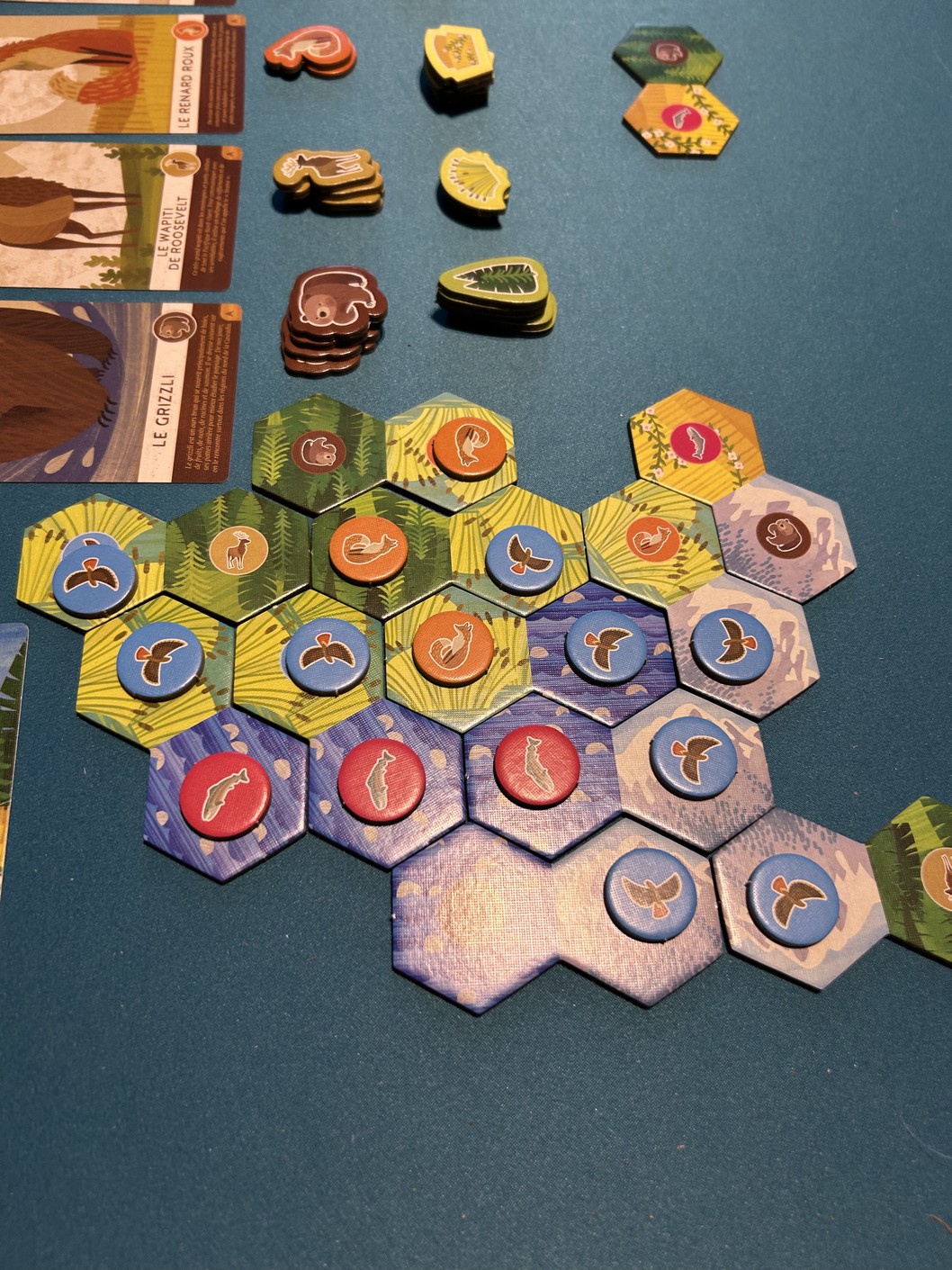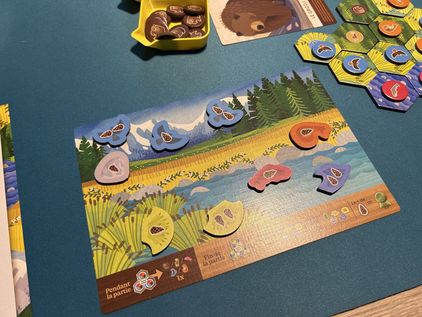 Le petit twist très sympathique, c’est que lorsqu’on y parvient, on récupère un meeple représentant l’animal correspondant pour le placer sur son plateau personnel. À la fin de la partie, cela donne naissance à une jolie fresque naturelle, unique à chaque joueur. Même les plus grands prennent plaisir à le faire, chacun selon sa méthode et son sens esthétique.