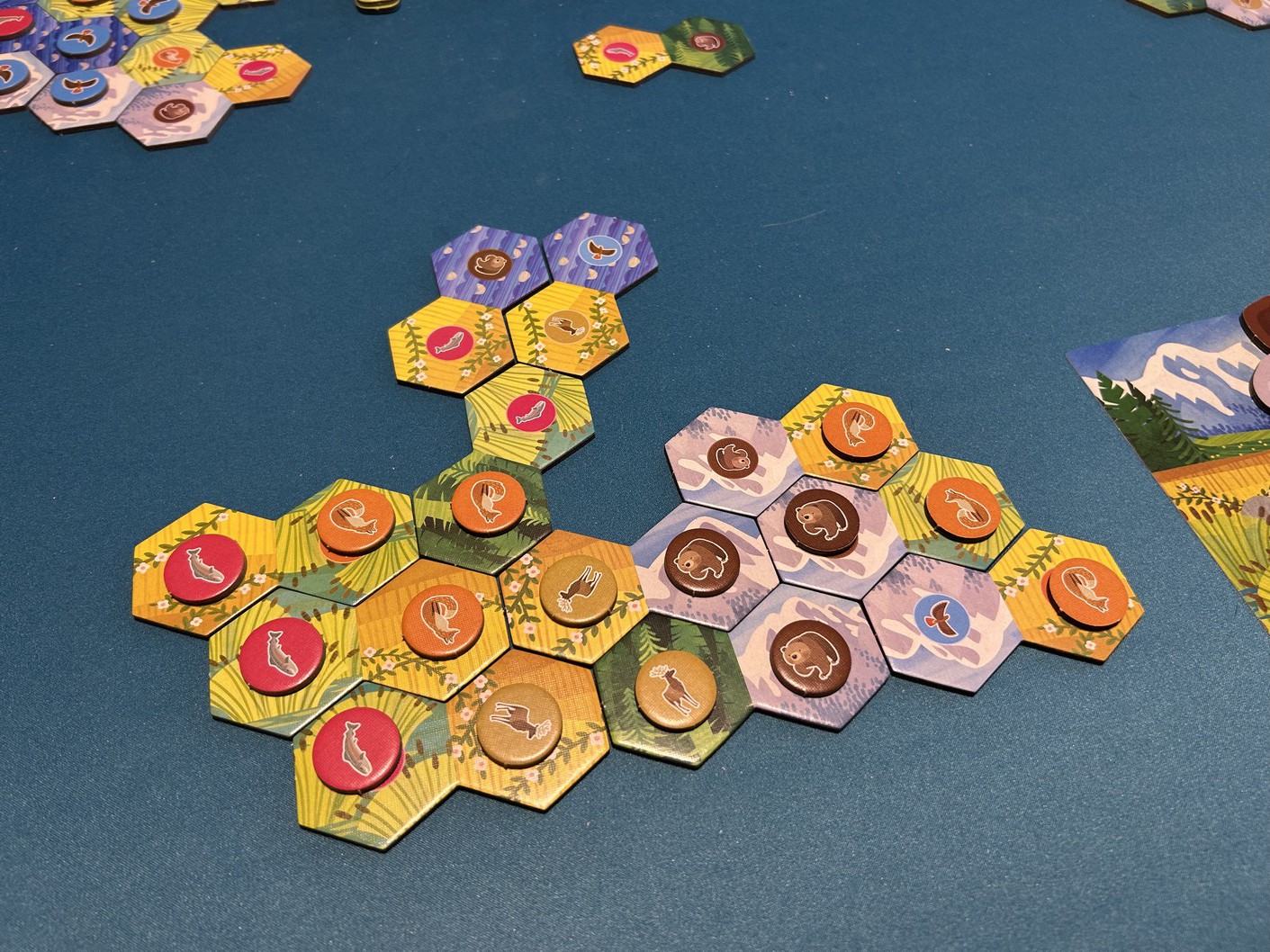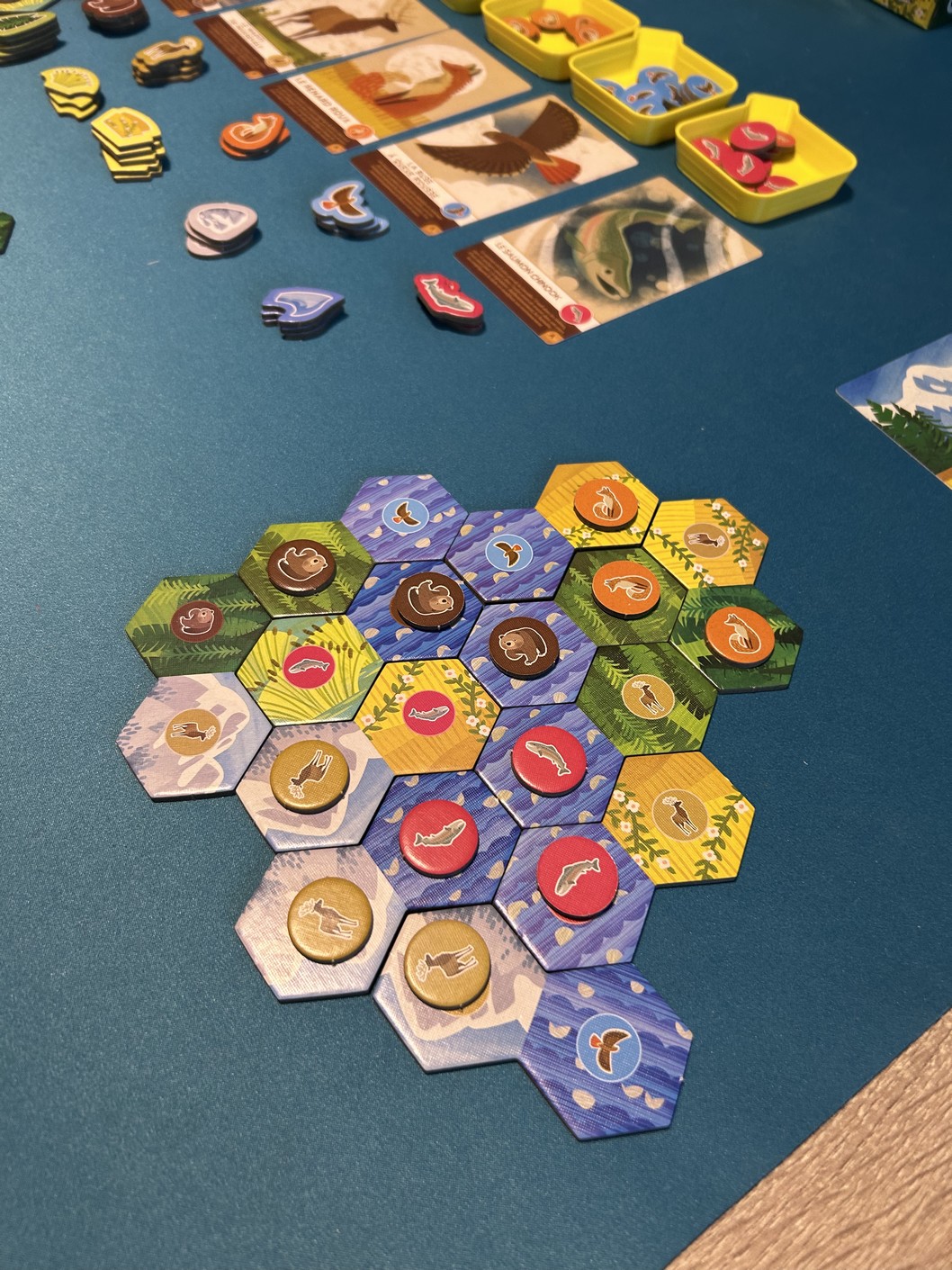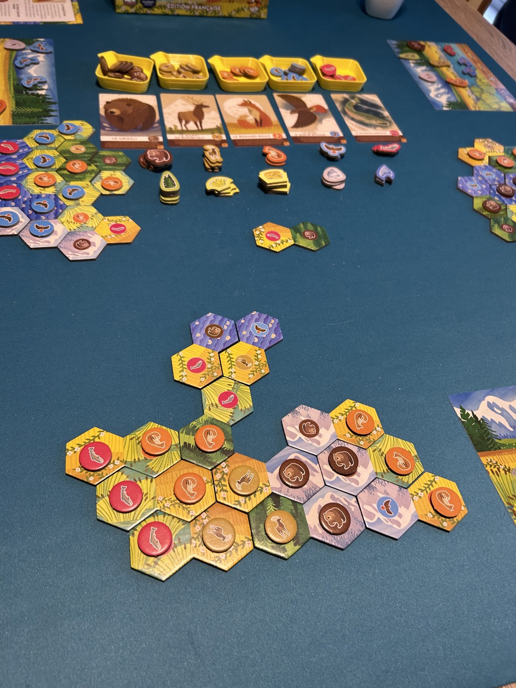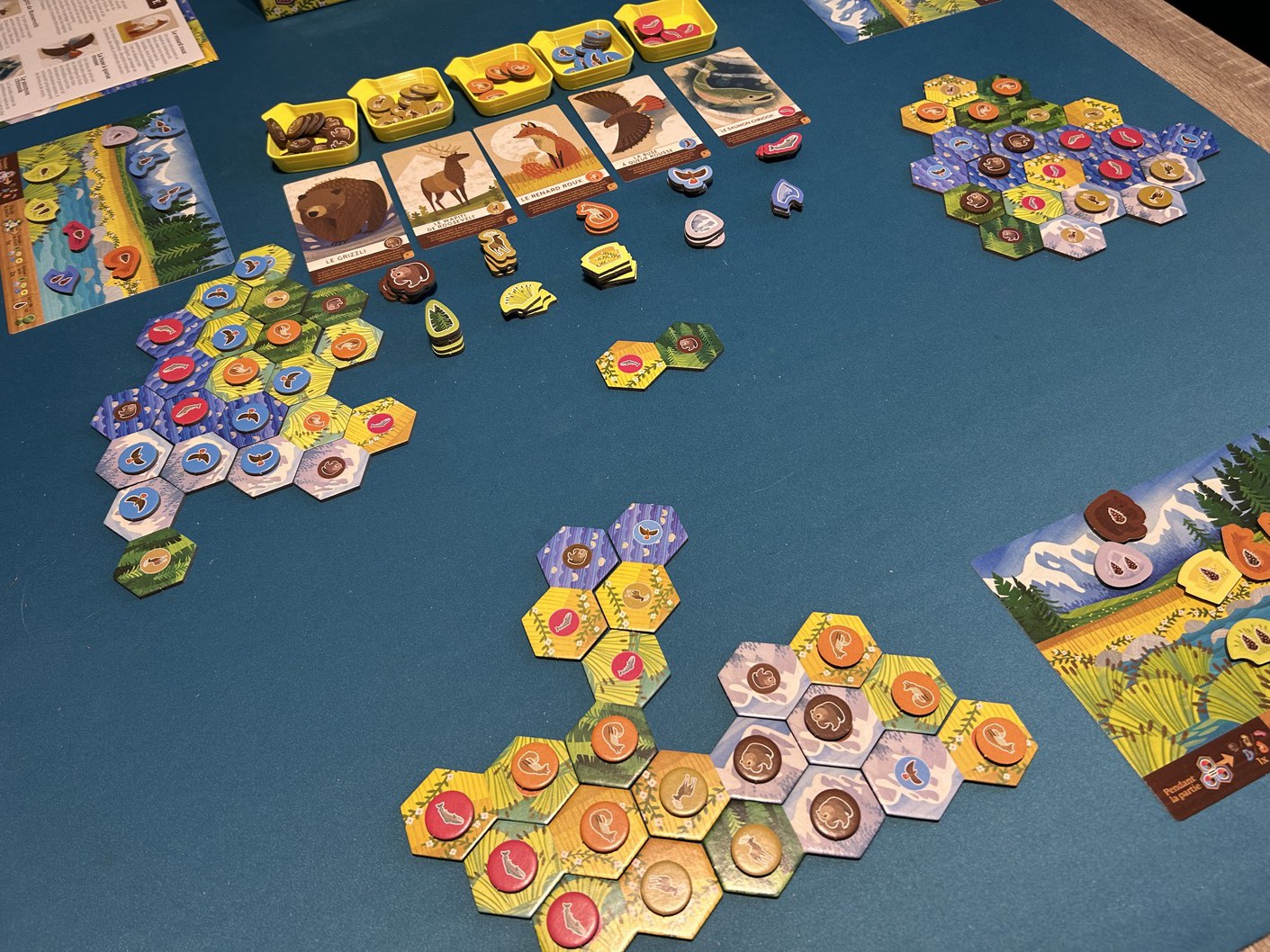 Le petit twist très sympathique, c’est que lorsqu’on y parvient, on récupère un meeple représentant l’animal correspondant pour le placer sur son plateau personnel. À la fin de la partie, cela donne naissance à une jolie fresque naturelle, unique à chaque joueur. Même les plus grands prennent plaisir à le faire, chacun selon sa méthode et son sens esthétique.