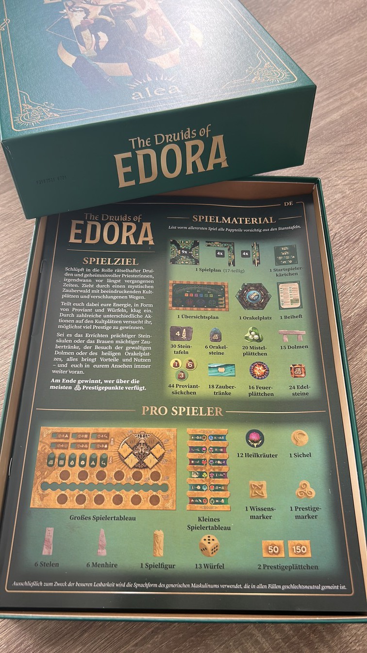 La boîte adopte un format rectangulaire classique, ornée d’une belle illustration sur un fond vert plutôt agréable. À vrai dire, je ne sais pas trop quoi en penser : ce n’est ni magnifique, ni vraiment laid ou désagréable. On est clairement face à un jeu à l’Allemande, comme on dit, avec ce petit côté old school indéniable — ce qui, pour ma part, n’est pas pour me déplaire.