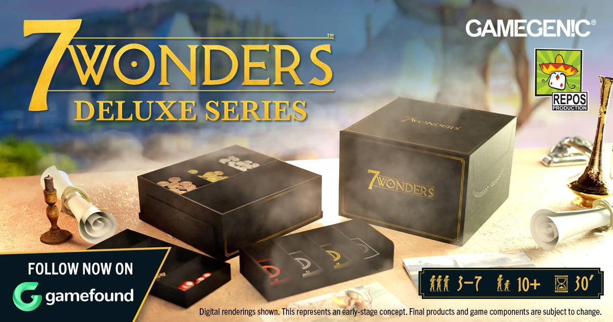 Repos Production annonce un partenariat avec Gamegenic pour proposer une version Deluxe de 7 Wonders. Pour le moment, peu d’informations ont été dévoilées. Voici toutefois le lien vers la future campagne Gamefound si vous souhaitez en savoir plus. Une courte vidéo en anglais est également disponible et permet d’en apprendre un peu davantage.