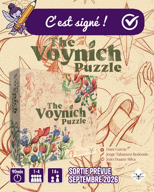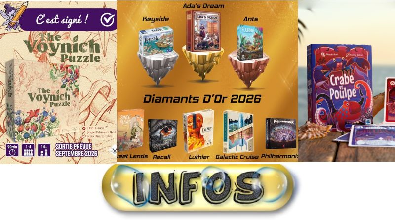 Pour cette semaine 07 de janvier 2026, je vous propose : Pixie Games nous nous annonce le jeu The Voynich Puzzle signé pour la localisation française, l’annonce des résultats du diamant d’or 2026,et pour finir La Boite de Jeu nous annonce un petit jeu à découvrir lors du festival de cannes : Crabe VS Poulpe.